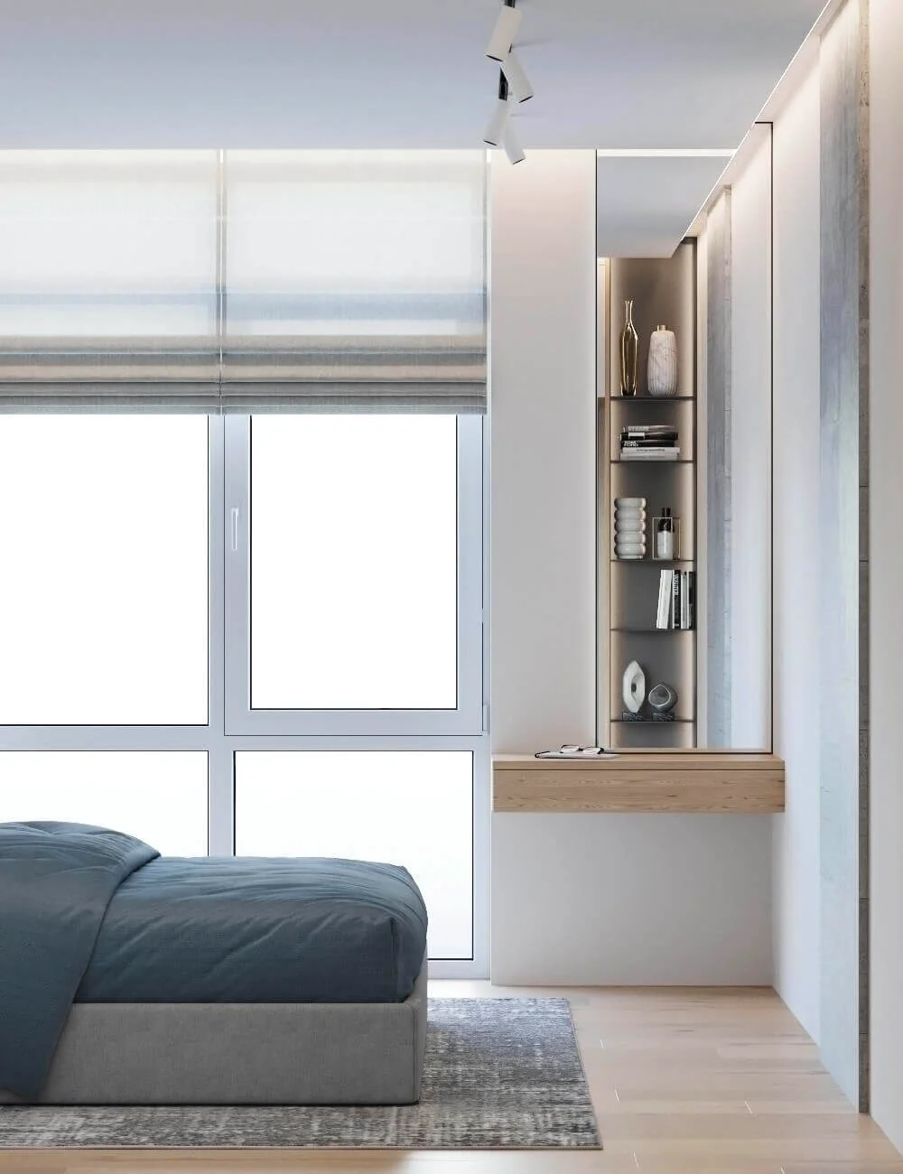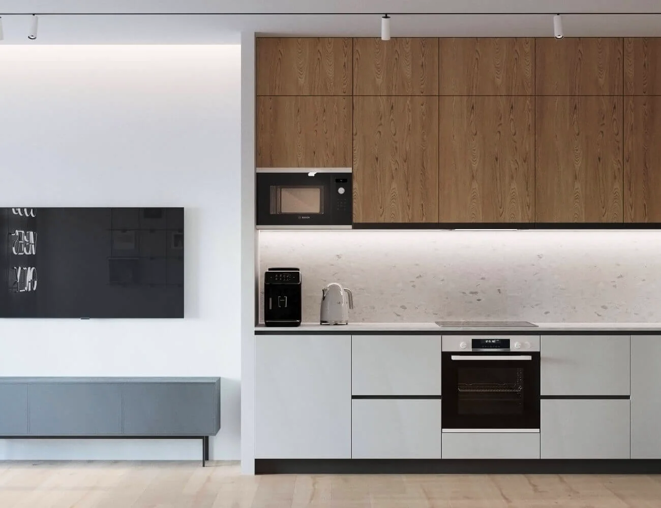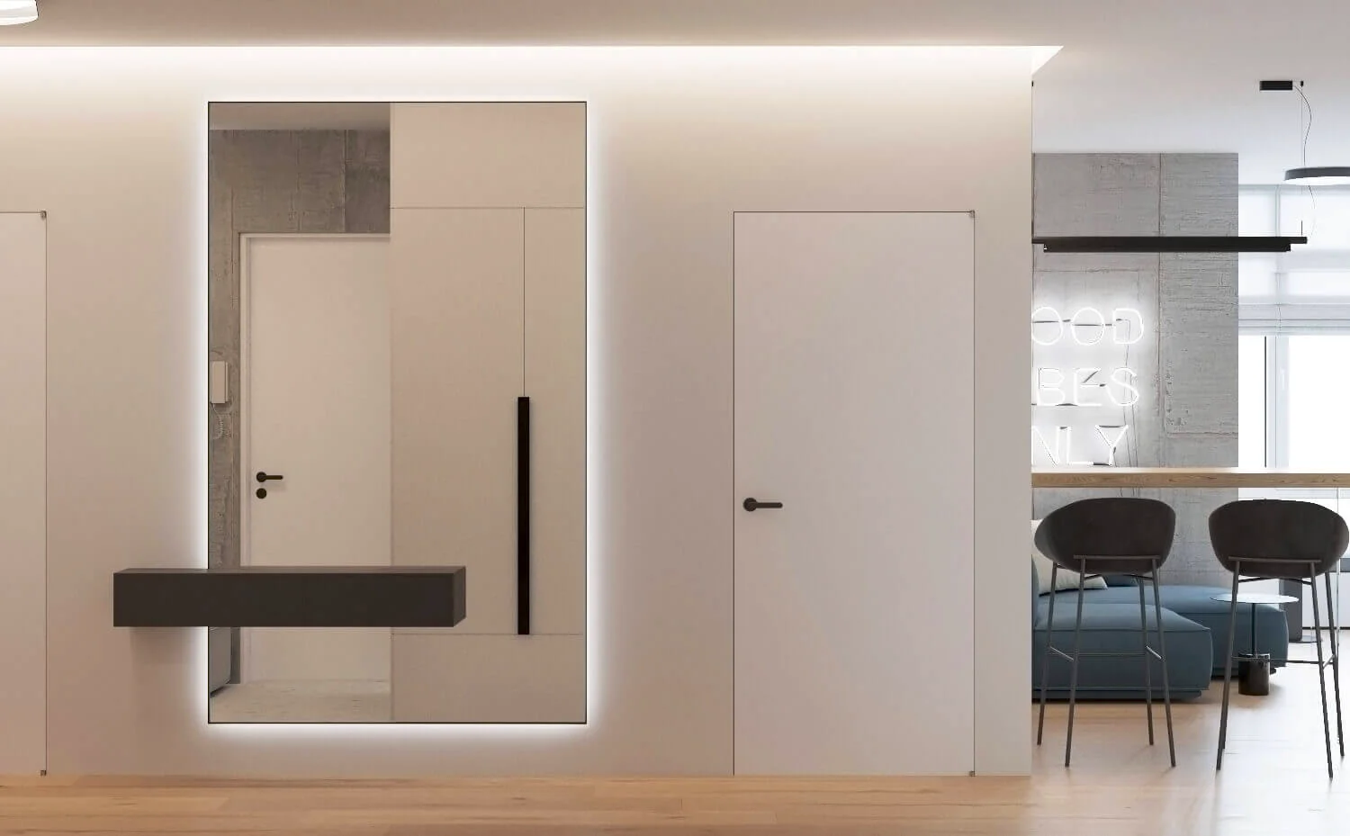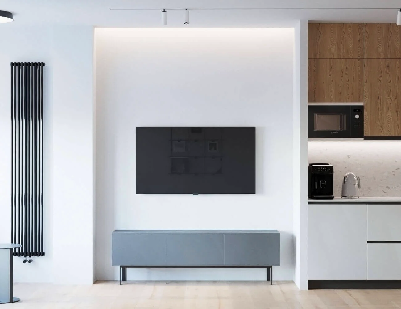 Квартира исполнена в современном минималистическом стиле. В площадь 65 м2 уместились – объединенная кухня-гостиная, мастер спальня, гостевая спальня и две ванные комнаты. Главным пожеланием заказчиков было создать максимально светлое пространство.