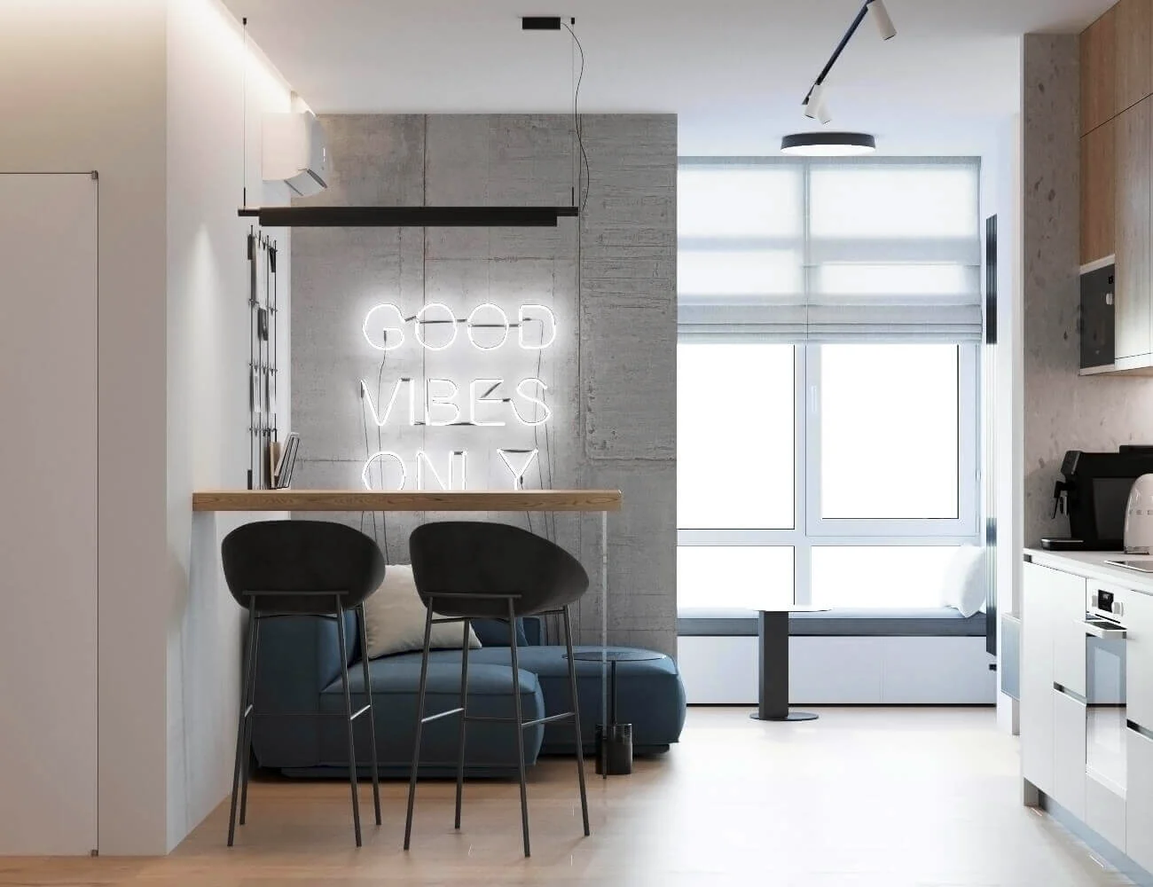 Акцентами стали – дерево светлого оттенка и синий цвет, именно они придали цвету и натуральности пространства.