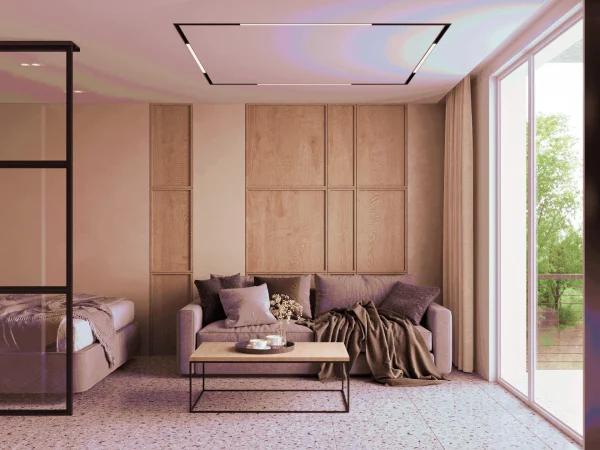 Стены обработаны мебельными панелями и декоративной штукатуркой, что придает разнообразие фактур и натуральность в пространстве